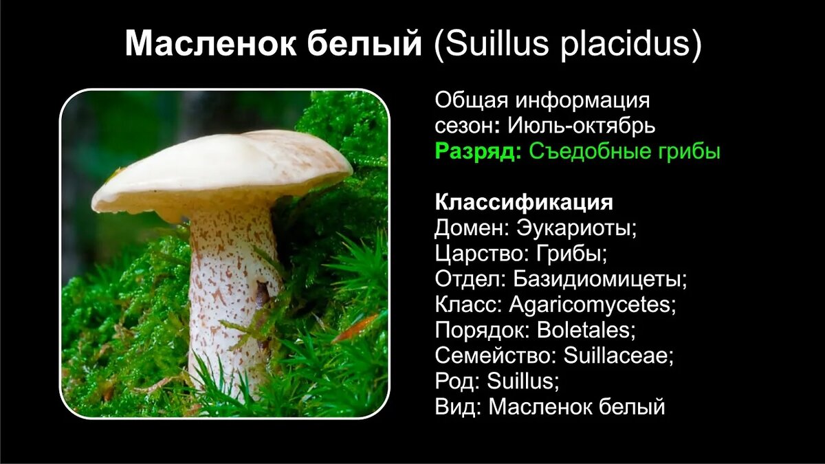 Маслёнок белый (Suillus (Boletus, Gyrodon, Ixocomus) placidus) — съедобный гриб рода маслёнок семейства маслёнковые (Suillaceae). Отличается белым цветом плодового тела. Подберёзовик болотный (белый; Boletus, Krombholzia, Trachypus (scaber f.) holopus) — вид грибов рода обабок (лекциниум, Leccinum) семейства болетовые (Boletaceae). (Под)осиновик белый (Leccinum aurantiacum (Krombholzia rufescens) var. (percandida) percandidum, Boletus (versipellis var.) percandidus) — съедобный гриб рода лекциниум (обабок, подберёзовик, Leccinum) семейства болетовых (Boletaceae). Иногда считается разновидностью (формой) подосиновика желто-бургого. Также белым грибом называют: Говорушка гигантская (Clitocybe gigantea) — Крым. Название: «горный белый гриб». Вёшенка степная (Pleurotus eryngii) — Средняя Азия. Название: степной белый гриб. Грибы, встречавшееся в этой статье кроме маслёнка (Suillus).