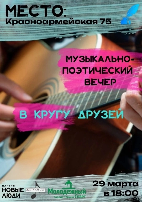 Мы, три инициативных томича, представляющие клуб авторов «ПоЗнание» (Сергей Панов), партию «Новые люди» (Андрей Родин) и Молодёжный Совет Города Томска (Павел Шадрин), объединили усилия, чтобы добавить красок и мелодий в культурную жизнь города. Мы приглашаем вас на волшебный музыкально-поэтический вечер «В кругу друзей»! 29 марта вас ждет атмосфера тепла, душевной близости и вдохновения, где звуки фортепиано, стихи и гитарные аккорды переплетутся в гармоничный аккорд. В уютной обстановке вы сможете насладиться живым исполнением прекрасных песен и проникновенными поэтическими строками от талантливых авторов, окунуться в мир творчества, созданный магией слова и музыки, почувствовать себя частью большого и дружного сообщества. Музыкальное сопровождение от Анастасии Луниной (фортепиано) создаст неповторимую атмосферу вечера! Ждем вас 29 марта в офисе партии «Новые люди» по адресу: г. Томск, ул. Красноармейская, д. 75. Начало в 18:00. Вход свободный, но нужна предварительная регис