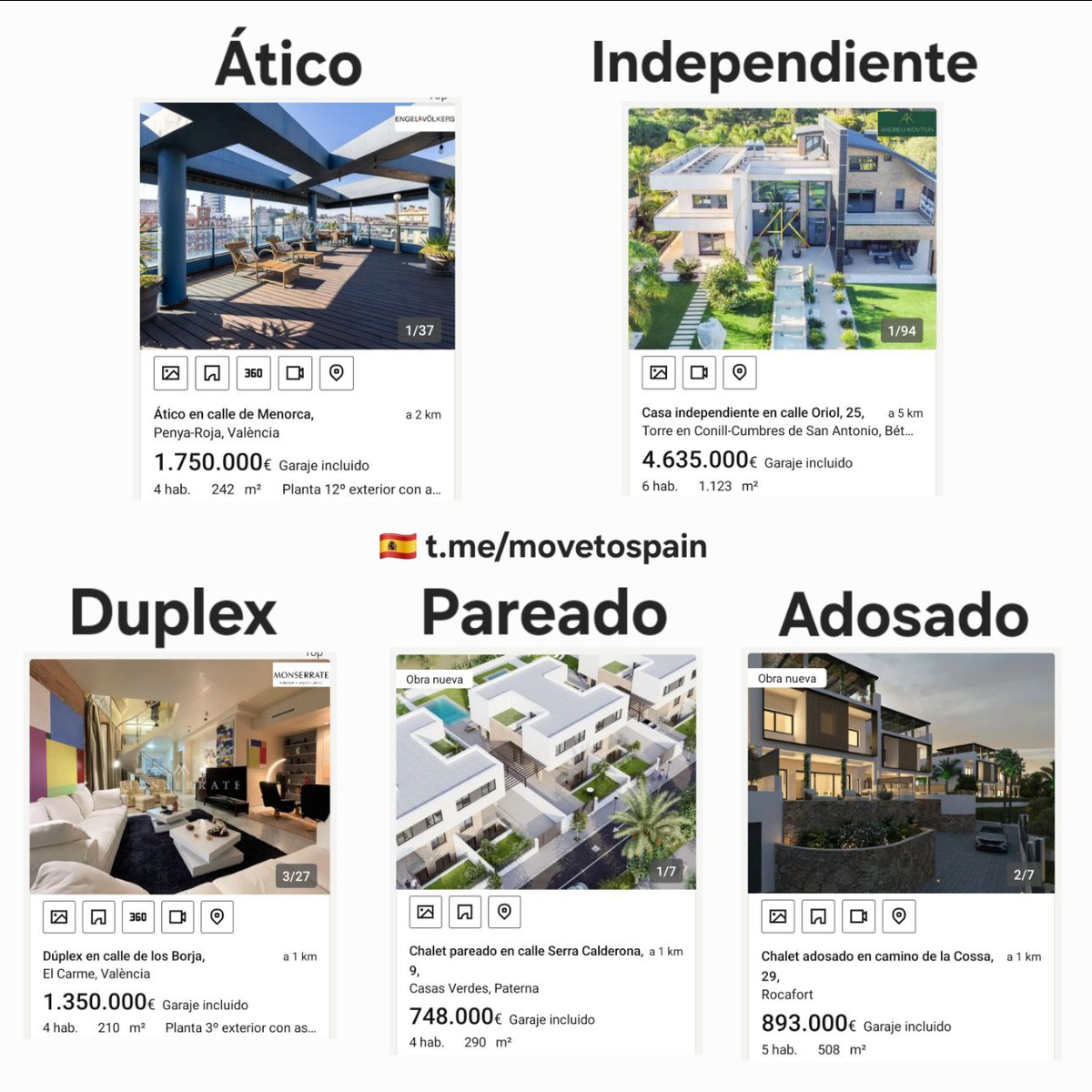 🏙 Типы недвижимости в Испании Idealista, главный испанский портал недвижимости, предлагает следующие категории: 🏗 Obra nueva, 🏙 Viviendas, 🏢 Oficinas, 🏪 Locales o naves, 🤝 Traspasos, 🅿️ Garajes, 🏞 Terrenos, 📦 Trasteros, 🏨 Edificios. Да, на портале есть и русский язык, но перевод не всегда точен. Пара слов о каждой категории, хотя некоторые из них, думаю, заслуживают отдельного поста. 🧑💻 🏗 Obra nueva - новостройки. Как правило, квартиры выходят в продажу на ранней стадии строительства, или еще до получения лицензии. Обычно строительство занимает 2-2,5 года. Но есть застройщики, которые не торопятся рано продавать квартиры и выставляют их за пару месяцев до ввода. 📖 Мой пост о покупке новостройки. (https://t.me/movetospain/745) 🏙 Viviendas - вторичные квартиры. Есть подкатегории: Pisos - обычные городские квартиры без особых примет. 🏙 Áticos - старый добрый пентхаус, т.е. последний этаж. Плюс - отсутствие соседей сверху, прямая связь с богом 😆. Минус - отсутвие соседе