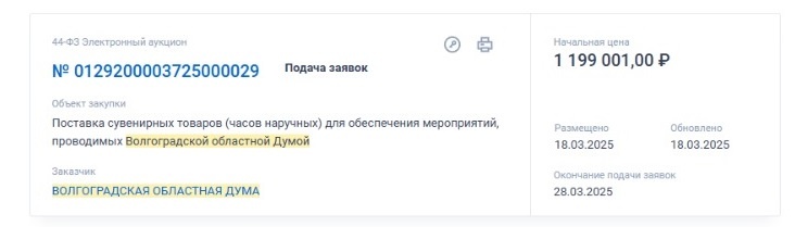 На Госзакупках говорится, что это будет партия сувенирных товаров в виде часов на руку. Покупка необходима для мероприятий, которые проводятся облдумовцами. Общая цена покупаемого составляет 1 миллион 199 тысяч рублей. В требованиях в закупке сказано, что мужские часы должны быть сделаны из нержавеющей стали, цвет корпуса — золотистый, а циферблат — серебристый. Кстати, само часовое стекло просят минеральное. Цифры нанесут римские, они будут выполнены в золотистом цвете. Сами стрелки тоже хотят видеть золотистыми. К этим часикам полагается кожаный коричневого цвета ремешок. Сувенир будет упакован в бордовый пенал со съемной крышкой-дном. Изделие положат на белую подложку из искусственной кожи.