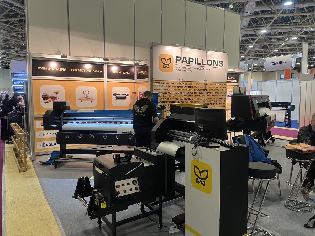 Звезда нашего стенда — Volk Neon-Signstar. Этот принтер умеет печатать неоновыми красками, что открывает новые горизонты для креативных проектов. Посетители буквально выстраивались в очередь, чтобы увидеть, как создаются светящиеся под УФ-лучами изображения.