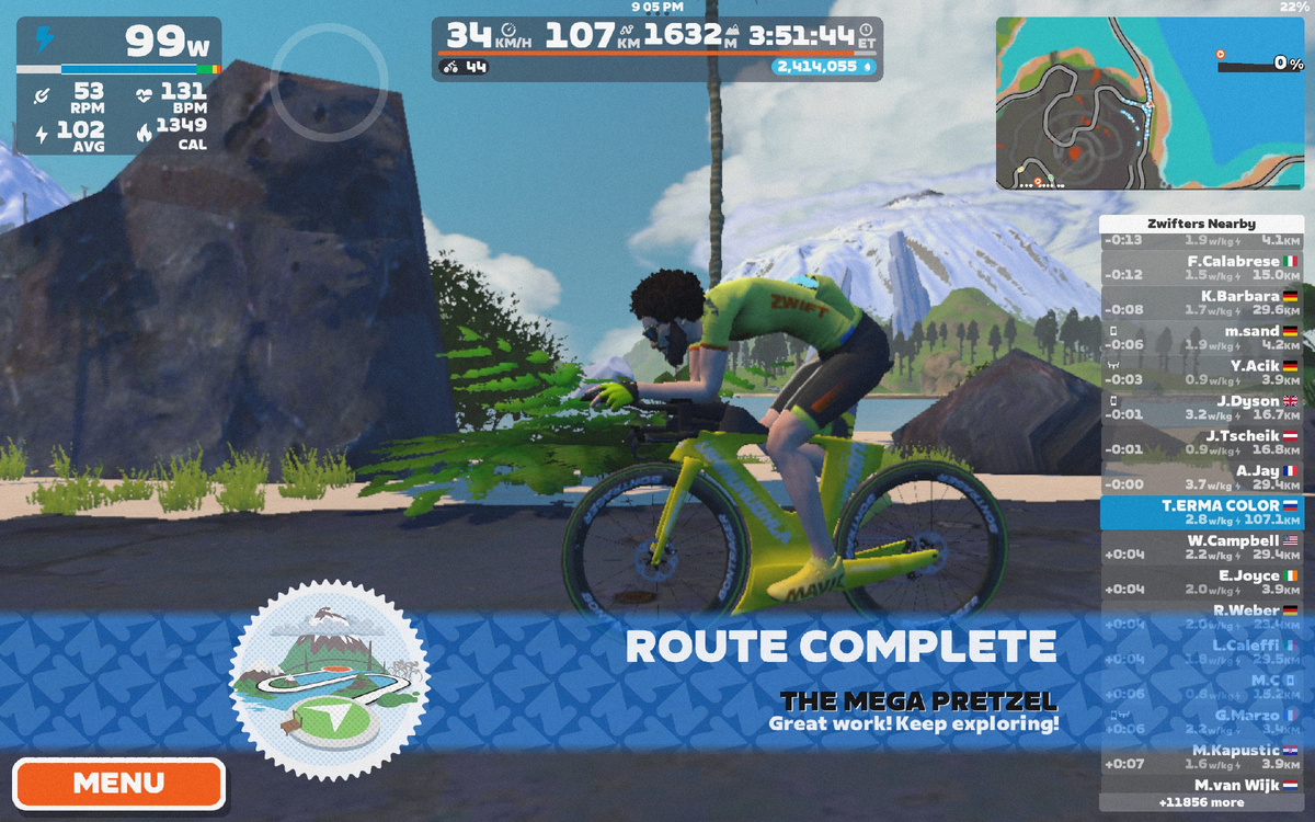 Пройти все трассы, предлагаемые симулятором, становится всё сложнее, так как короткие и средние дистанции преодолены, и остаются самые большие. Хорошо, что подхожу к ним уже с определенным уровнем подготовки. Вчера (19.03.2025) в качестве очередной трассы была выбрана THE MEGA PRETZEL. Маршрут протяженностью 107 километров и общим набором высоты 1632 метра. Такие расстояния я ещё никогда не преодолевал. Скажу честно, доезжал на морально-волевых :). Последние километры давались очень тяжело. До финиша доехал пустой. На этот маршрут у меня ушло чуть меньше 4-х часов. Но надо сказать, что трасса очень интересная. Красивые места WATOPIA как всегда радуют глаз. Ну и конечно же такой набор высоты ещё больше приблизил меня к Tron Bike, до которого осталось совсем немного. Плюс ко всему, за преодоление этой трассы я получил большое количество бонусных баллов, что в плотную приблизило меня к 45 уровню. Одни плюсы :). Сегодня чувствуется лёгкая усталость после вчерашнего пробега, но это прият