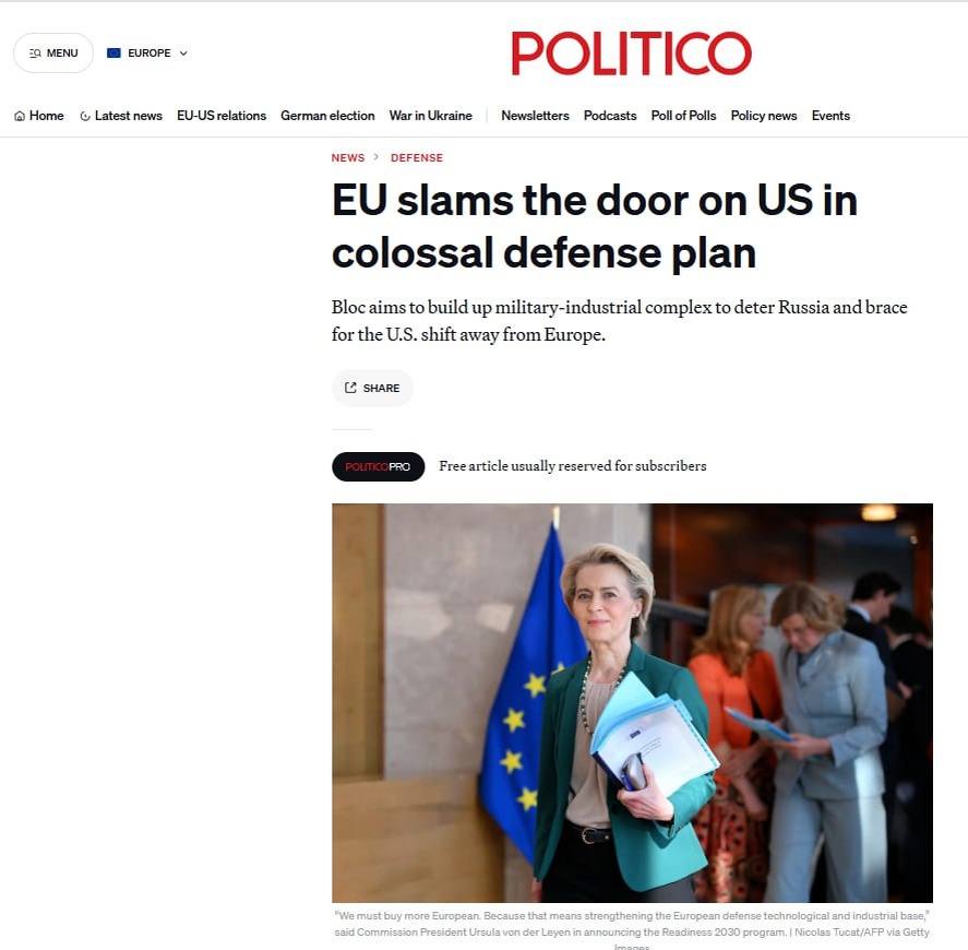 ЕС закрывает двери для США в своем распиаренном грандиозном оборонном плане стоимостью 800 миллиардов долларов. Как утверждает европейская версия издания Politico со ссылкой на обнародованные детали финансирования оборонного сектора ЕС, американские производители оружия оказались за бортом европейского оборонзаказа. Отмечается, что вне этого процесса — по крайней мере, пока — остается и Великобритания. Европейский Союз стремится укрепить свой военно-промышленный комплекс, чтобы сдержать Россию и подготовиться к изменению стратегических приоритетов США, -пишет издание. «Мы должны покупать больше европейского. Ведь это означает укрепление европейской оборонной технологической и промышленной базы», – заявила президент Еврокомиссии Урсула фон дер Ляен, анонсируя программу Readiness 2030. Чтобы укрепить связи с партнерами, Брюссель привлек к своей инициативе не только членов Европейской ассоциации свободной торговли (EFTA), но и неевропейские страны, например Южную Корею, и Японию. Надо ск