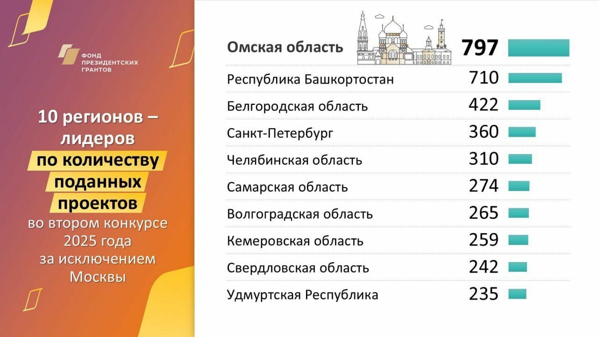 Башкортостан уверенно подтверждает статус региона с высокой гражданской активностью. Во втором конкурсе президентских грантов 2025 года республика заняла второе место по количеству поданных заявок (за исключением Москвы). Некоммерческие организации региона направили на конкурс 710 проектов, что является рекордным показателем для Башкортостана. Больше заявок подали только НКО Омской области (797 проектов), а замыкает тройку лидеров Белгородская область (422 заявки). Всего на конкурс поступило 10 882 проекта от 9 359 некоммерческих организаций со всех 89 регионов страны. Основными направлениями инициатив стали «охрана здоровья граждан, пропаганда здорового образа жизни» (1 914 заявок, 18%), «сохранение исторической памяти» (1 890 заявок, 17%) и «социальное обслуживание, социальная поддержка и защита граждан» (
