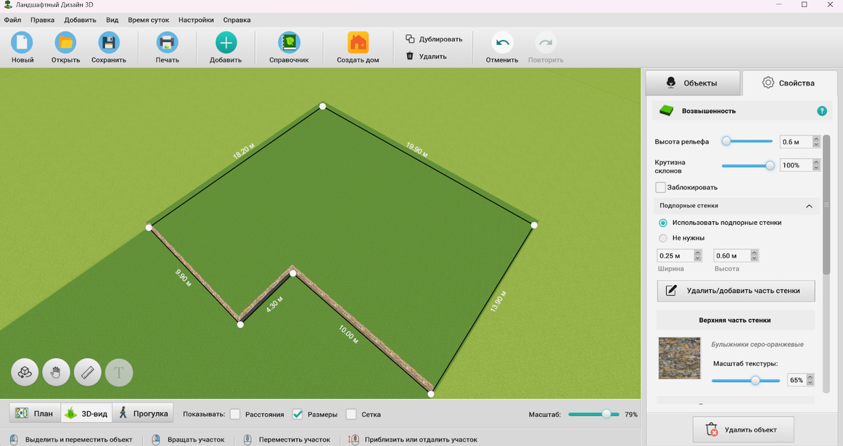 6 соток — небольшой участок, поэтому следует уделить особенное внимание зонированию. Если все сделать грамотно, во время отдыха в беседке вы сможете спокойно любоваться цветником, а не дачным туалетом. Чтобы после строительных работ не возникло неприятных неожиданностей, предлагаем визуализировать планировку участка 6 соток в специальных приложениях. В статье показали, как ее можно оформить в программе Ландшафтный Дизайн 3D. Это один из самых простых планировщиков, в нем легко освоится даже новичок. А качество модели не уступает другим, сделанным в профессиональных программах. Откройте программу и нажмите «Создать проект участка». Задайте форму, проверьте соотношения сторон. Рекомендуем ориентироваться по компасу на стороны света, чтобы модель соответствовала реальному положению участка. Если на территории есть перепады высот, добавьте их с помощью функции «Рельеф». Просто выберите возвышенность, низменность или склон, затем настройте параметры: угол наклона, форму и прочее. На этом эт