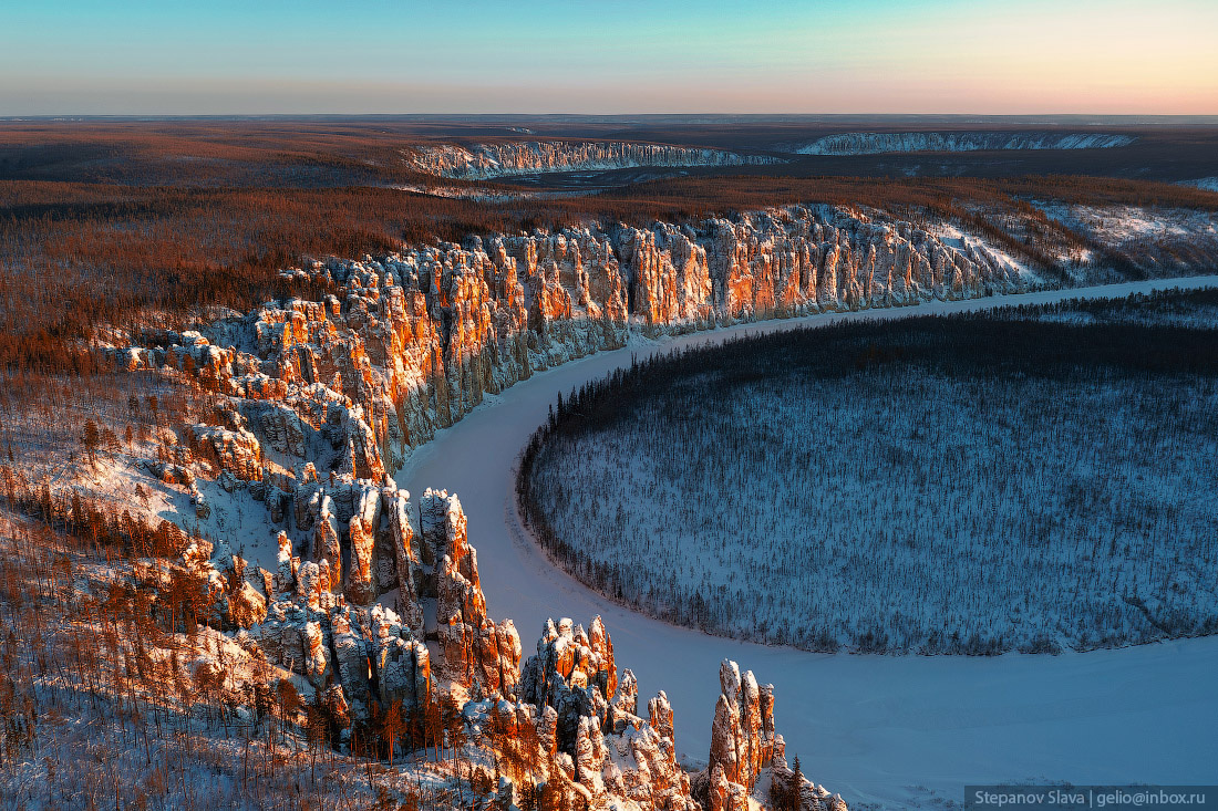 1. Синские столбы находятся в Якутии — самом большом регионе России. Это также самый холодный регион — именно в Якутии находится полюс холода Северного полушария Земли, где температура опускалась до рекордных −68 °C, а по другим данным даже до −77,8 °C.