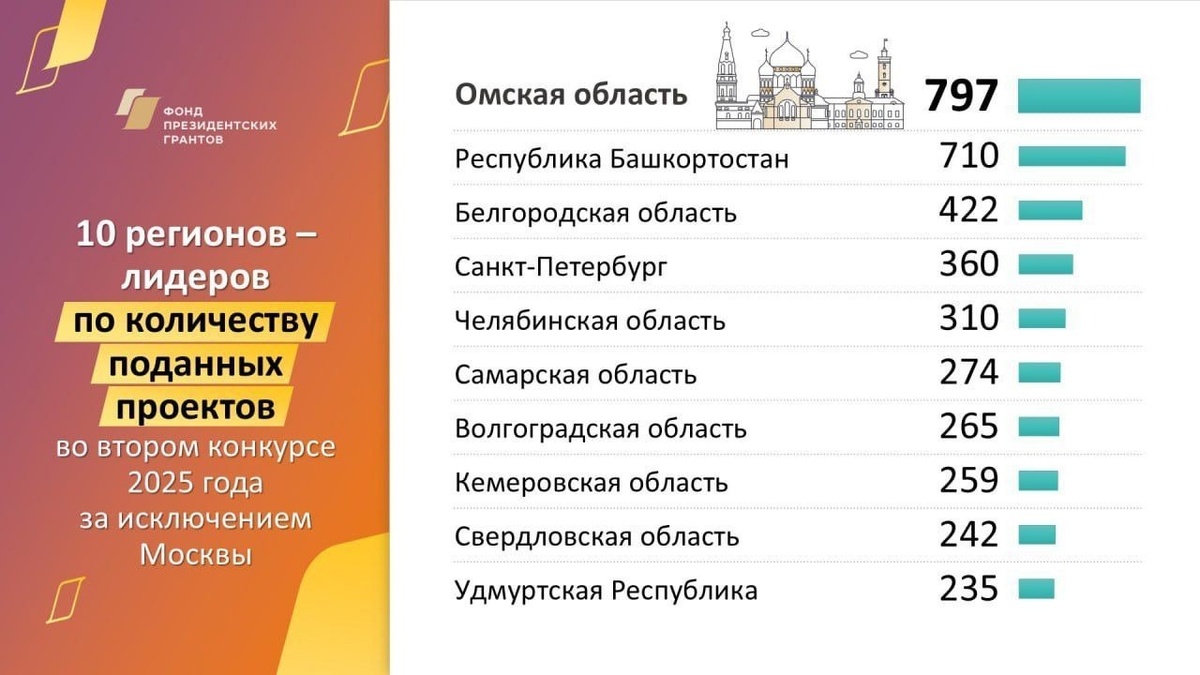 Республика Башкортостан уверенно подтверждает свой статус региона с высоким уровнем гражданской активности. Во втором конкурсе президентских грантов 2025 года республика заняла второе место по количеству поданных заявок, уступив только Москве. В этом году некоммерческие организации региона продемонстрировали рекордное количество заявок на участие в конкурсе — 710 проектов. Больше только в Омской области, где было подано 797 заявок, а замыкает тройку Белгородская область с 422 заявками. Всего на конкурс было подано 10 882 проекта от 9 359 некоммерческих организаций из 89 регионов страны. Основные направления инициатив — это «охрана здоровья граждан и пропаганда здорового образа жизни» (1 914 заявок, 18%), «сохранение исторической памяти» (1 890 заявок, 17%) и «социальное обслуживание, социальная поддержка и защита граждан» (1 649 заявок, 15%). Почти половина проектов (49%) претендует на гранты до 1 млн рублей, а 43% — на суммы от 1 до 5 млн рублей. Артур Гильманов, член Общественной па