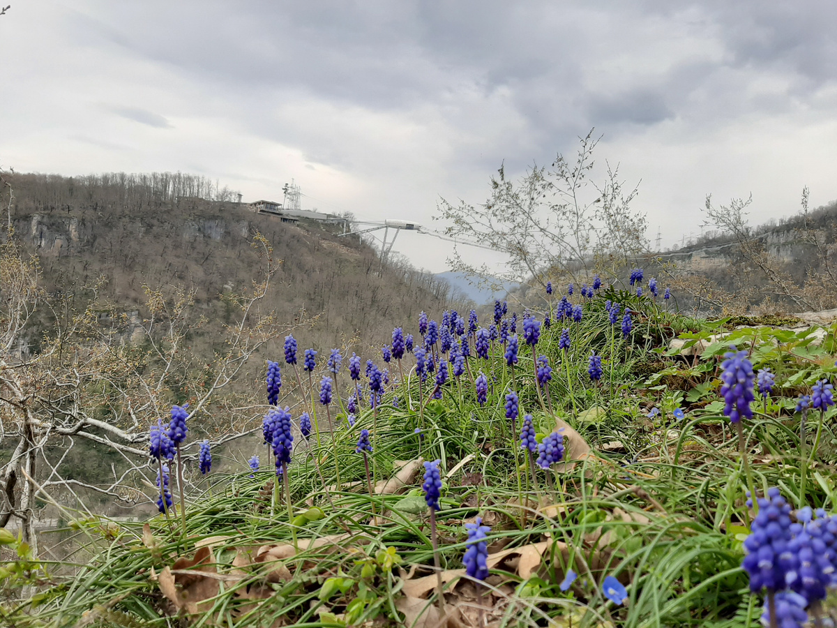Всем огромный турпривет, как обычно! Продолжаем тему сочинских походов и их весьма трудно представить без маршрутов Красной поляны, ведь здесь уже самые настоящие горы! Весной мы часто выезжаем в Сочи прогуляться: еще нет жары, толп, пробок, огромных цен, на маршрутах чаще пустынно, а водопады особенно красивы. Поселившись, по традиции в Имеретинском курорте, один из походов решили посвятить Дзыхринскому водопаду и красивейшему ущелью. Сели на местный автобус и доехали до остановки Форелевое хозяйство. Еще один плюс межсезонья-автобусы ходят быстро и регулярно, что позволяет не тосковать о личном транспорте. Форелевое хозяйство находится в селении Казачий брод. По улице Форелевой неспешно идем к Мзымте и сразу же первая достопримечательность- Ахштырское ущелье с подвесным мостом. Мостик добротный, с красивыми видами на обе стороны ущелья. Сразу же за мостом слева живописный скальный уступ над Мзымтой. Собираемся с духом-дальше только вверх. По тропе с удобными скальными ступеньками и
