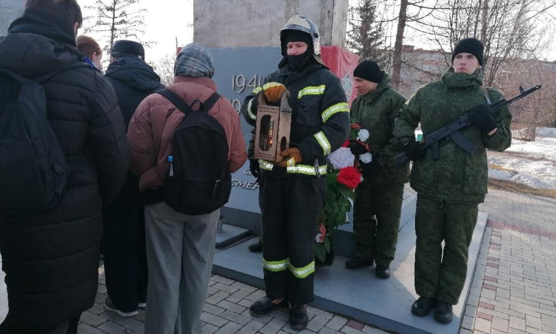 Лампаду с огнём из Татарского района, куда её передали из Омской области, в Куйбышев доставил командир отделения отдельного поста 13 пожарно-спасательной части 4 пожарно-спасательного отряда Алексей Гросс. Его прадед воевал в Великую Отечественную войну.