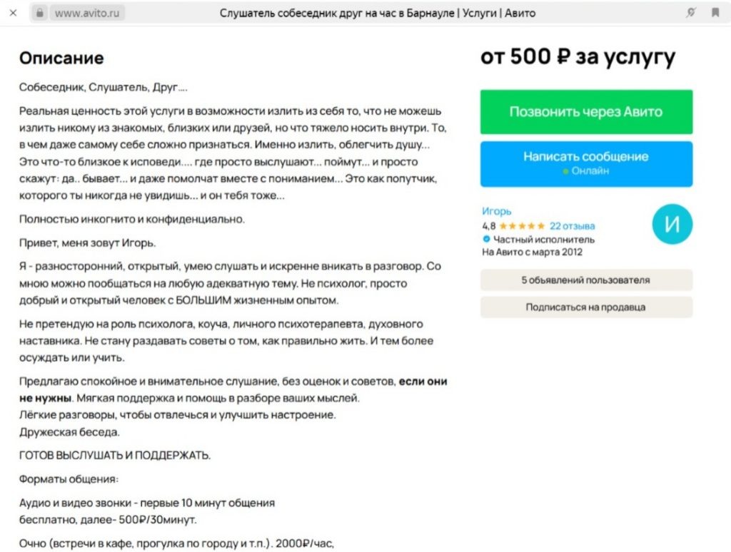 «Друга на час» можно найти на популярной платформе объявлений в Барнауле. Цены доступные: час душевного общения стоит от 200 рублей. Исполнители обязуются выслушать вас, поддержать и улучшить настроение. Многие из них уточняют, что их предложения не предполагают романтических отношений. На «Авито» размещено более 100 объявлений, предлагающих такие услуги в Барнауле. Изучив их, диву даешься: тут тебе и «собутыльник-друг», готовый выслушать твои пьяные откровения, и «собеседник», обещающий интеллектуальные беседы (главное, чтобы темы были не о ценах на коммуналку), и просто «слушатель», готовый впитать все твои печали. Один из «друзей на час» рассказал, что его услугами чаще всего пользуются люди, которым трудно общаться. Им сложно просто завести разговор или пригласить человека куда-то, а такая услуга не вызывает стресса. Психолог Никита Кисляков считает, что популярность таких услуг может быть связана с желанием людей найти понимание и поддержку, особенно когда они не хотят беспокоить