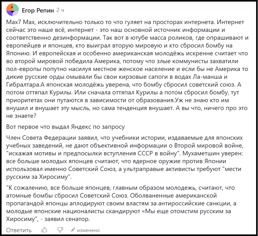 "Существуют разнообразные утверждения и слухи относительно знаний японской молодежи о том, кто сбросил атомные бомбы на Хиросиму и Нагасаки. Однако достоверные данные, подтверждающие, что значительная часть японцев считает Советский Союз ответственным за атомные бомбардировки, отсутствуют.