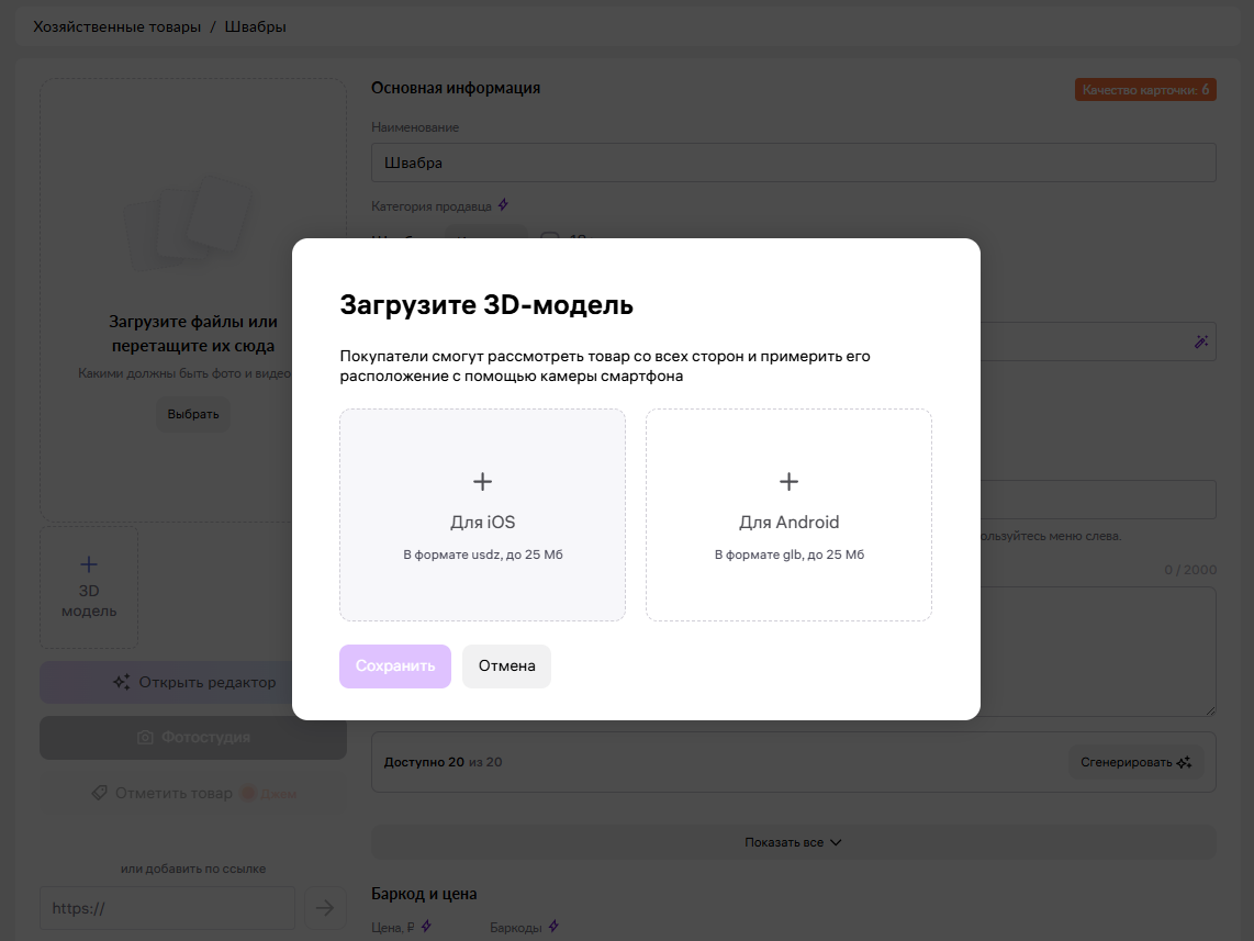 Поставщик может загрузить 3D-модель товара в некоторых категориях, а покупатель с помощью камеры смартфона может примерить расположение товара в интерьере.