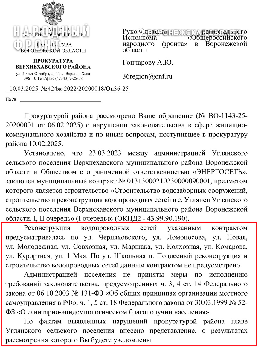 Об этом в ответ на обращение Народного фронта сообщили в прокуратуре. Школьная действительно оказалась вне госконтракта на реконструкцию и строительство водопроводных сетей. Тем самым муниципалитет нарушил два федеральных закона. Главе Углянского сельского поселения внесено представление. Ранее Народный фронт рассказал, что улицу Школьную поселка Подлесный лишили водопровода в рамках программы "Чистая вода". Чиновники объяснили это тем, что люди якобы сами отказались от участия в программе. Народный фронт попросил СК и прокуратуру дать правовую оценку этой странной ситуации. Народный фронт продолжает держать решение проблемы на контроле.