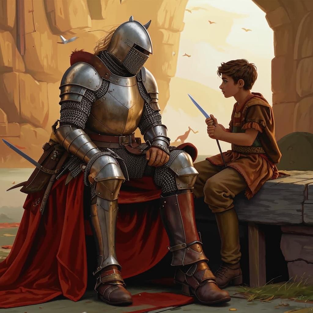 Солнце уже клонилось к закату, окрашивая облака в оттенки золота и пурпура, когда рыцарь наконец-то опустился на колени посреди поля битвы. Его доспехи были покрыты трещинами и царапинами, а плащ, некогда гордо развевавшийся на ветру, теперь висел, словно тяжёлая мокрая тряпка. Кровь, стекающая по его лицу, смешивалась с потом, оставляя красные ручьи на щеках. Вокруг него лежали тела павших воинов — друзей и врагов, — но он не обращал внимания ни на их стоны, ни на мольбы о помощи. Его взгляд был устремлён вдаль, туда, где ещё недавно звучали боевые рога и топот копыт. — Мальчик... — прохрипел рыцарь, обернувшись к своему оруженосцу, который стоял рядом, дрожа от страха и усталости. — Подойди ближе... Оруженосец, едва держась на ногах, сделал несколько шагов вперёд. Его глаза были полны слёз, а руки судорожно сжимали меч, который казался ему сейчас таким же бесполезным, как детская игрушка. — Я не могу... — прошептал он, глядя на своего господина. — Не могу оставить тебя здесь...