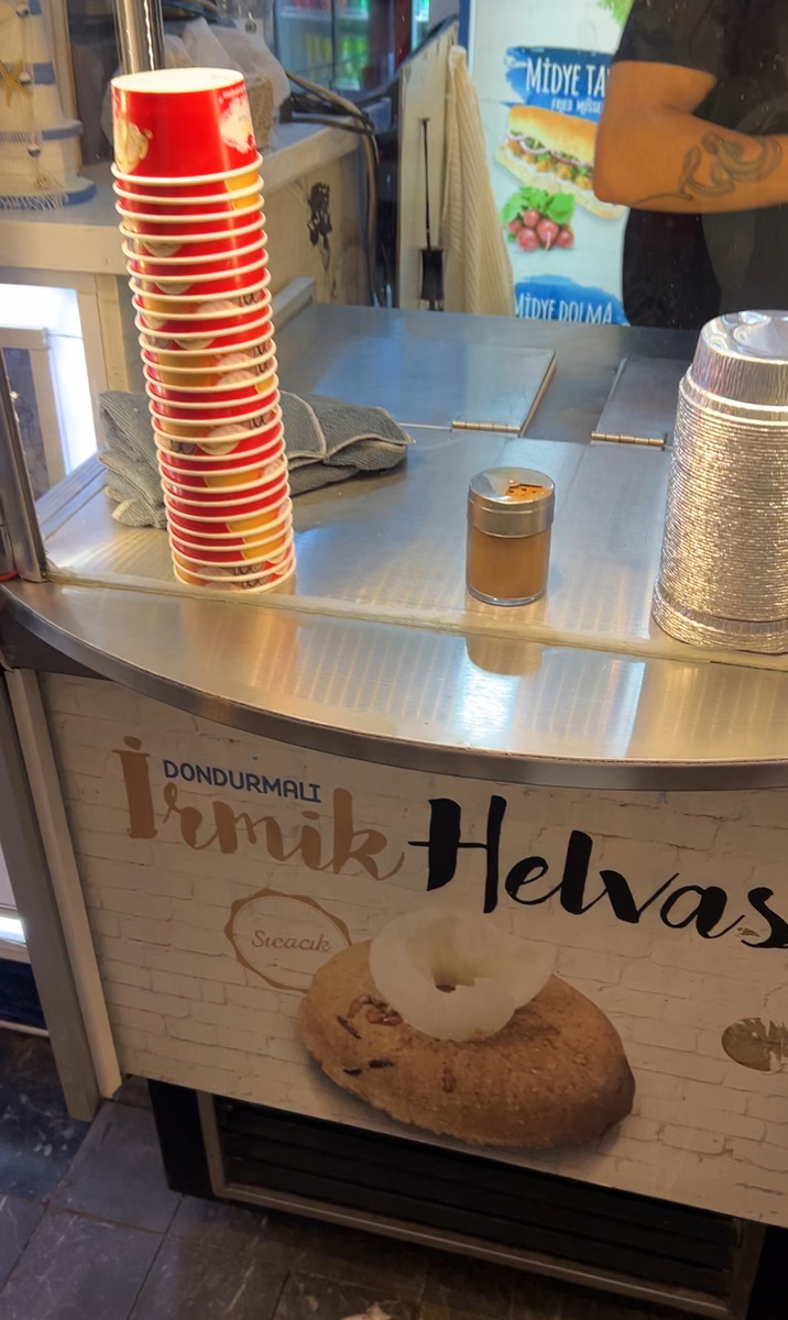 Во время этой поездки в Анталию в популярной точке местного фастфуда (бутербродов с жареной рыбой или морепродуктами), где в любое время дня и ночи все столы заняты и местными, и туристами, мне приглянулась в меню единственная позиция десерта с интересным названием Irmik Helvasi.