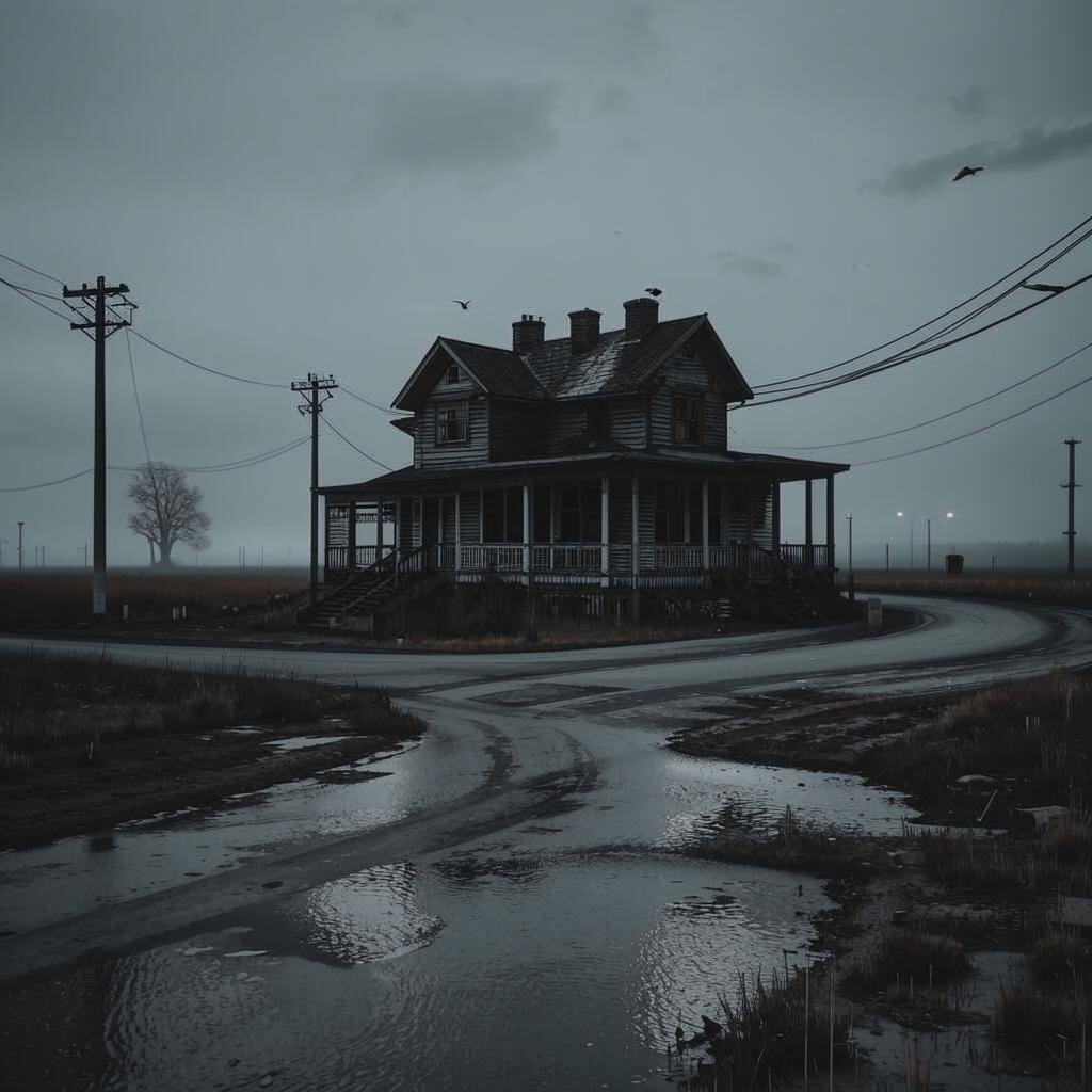Светлячки мерцали в густых кронах деревьев, окружавших старый дом. В воздухе витал аромат свежесрезанной травы, смешанный с легким запахом дождя, который недавно прошел над этими местами. Дом стоял одиноко на перекрестке двух дорог — одной асфальтированной, другой, грунтовой, уходящей вдаль в лесную чащу. Высокие окна, закрашенные плесенью, тускло отражали закатный свет, придавая зданию зловещий вид.