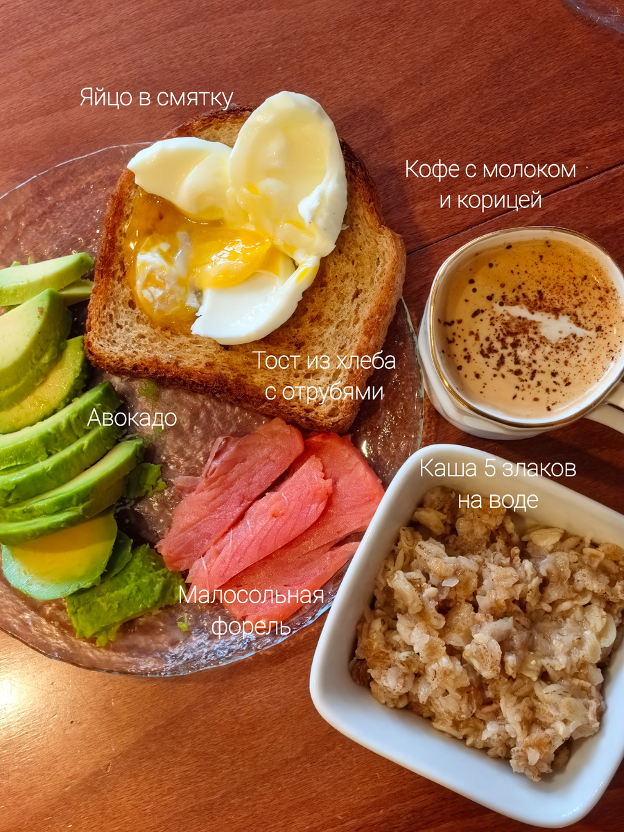 В этом завтраке есть всё, чтобы зарядиться силой, пользой и энергией для новых свершений. И не наесться при этом быстрых углеводов, от которых калорий много, а толку мало. • яичко всмятку • тост из хлеба с отрубями • авокадо • красная рыбка • каша 5 злаков на воде • кофе с молоком и специями (без сахара) P.S. порцию можно было уменьшить раза в два, я чуть не лопнула. Ваша Вэл.