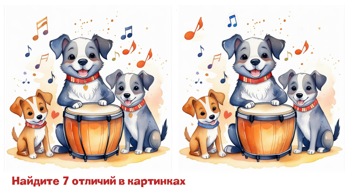 Как говорят музыканты: "Внимательный слух и зоркий глаз – залог гармонии в любом оркестре." Три весёлых щенка решили устроить концерт. Барабан, нотки, улыбки – всё готово для выступления. Но что-то пошло не так… То ли ноты перепутались, то ли барабан изменил цвет? А может, кто-то из щенков потерял свой ошейник? Найди 7 отличий и помоги этой музыкальной команде завершить концерт! Горизонтальный тест найди отличия: Вертикальный тест на внимательность: Тебя не обманешь – всё разглядела, как настоящий дирижёр. Быстрей разберись с пропавшими пазлами и пусть день будет таким же гармоничным, как этот концерт. До встречи!