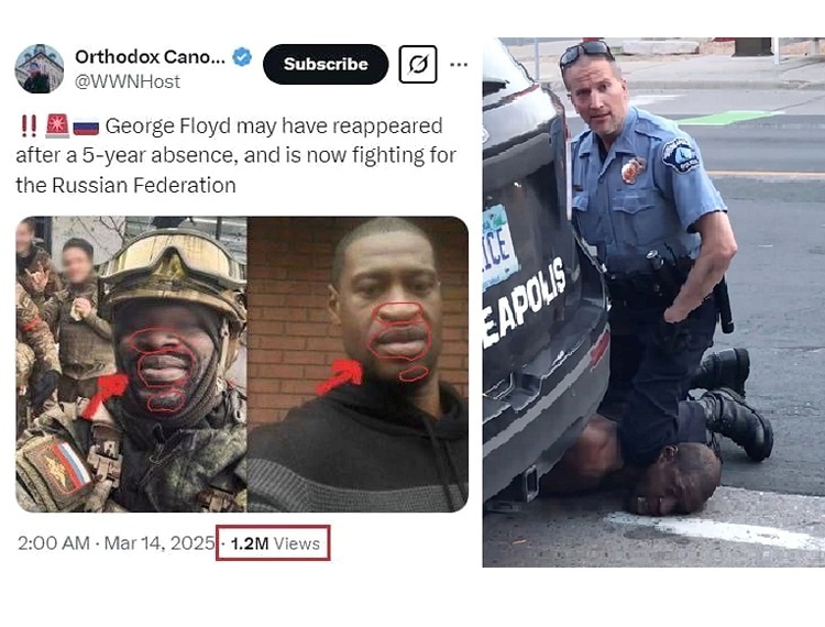 В Западных странах стремительно набирает популярность новая конспирологическая теория. Внимание общественности привлекло поразительное сходство между помершим от передозировки наркотиков негром Флойдом, имевшим криминальное прошлое, и негром на снимке среди солдат Вооруженных Сил РФ. Определенная часть населения англоязычных стран убеждена, что Флойд инсценировал свою смерть и теперь принимает участие в боевых действиях на стороне РФ. В американских социальных сетях активно обсуждается вопрос, действительно ли изображенный на фотографии является Флойдом. Некоторые утверждают, что Флойд был российским агентом, целью которого была дестабилизация обстановки в Соединенных Штатах. Эта тема даже стала предметом обсуждения на телевизионных каналах. Тем не менее, часть пользователей сети проявляет разумный скептицизм и чувство юмора. Они высказывают свои мысли примерно в таком ключе. Так смешно, что не могу дышать. Семья рецидивиста Флойда выражает опасения, что их могут лишить всех полученны