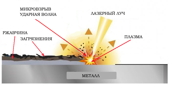 Важным моментом в теме лазерной очистки является применение именно ИМПУЛЬСНОГО лазера. Такой лазер, в отличие от непрерывного, которым производится резка и сварка металлов, не оказывает разрушительного термического воздействия на кузов. Очистка импульсным лазером, по сути ближе к бережной механической очистке, так как задействуется механизм микро абляции, когда под воздействием лазерного импульса на поверхности формируется микровзрыв, который удаляет различные загрязнения и ржавчину, практически не повреждая металл. В случае же непрерывного лазера, идет сильный нагрев, проще говоря, очистка непрерывным лазером напоминает очистку горелкой и очень высок риск повреждения кузова, нарушение структуры металла, температурное коробление и т. п., не говоря уже о различном оборудовании, проводке и элементов облицовки. Кроме того, лазерная очистка не имеет как такового чистящего вещества, как напр