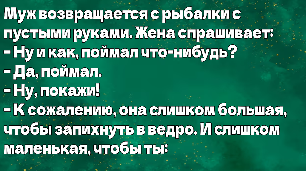 наелась. Мужчина с удочкой на льду «Когда твоя единственная цель — поймать рыбу, но ты вдруг понимаешь, что в жизни не всё так просто. Прокачиваешь не только умение ловить, но и философские размышления о том, что лучше: оставить удочку или попытаться вытащить свои мысли из льда.» Поплавок на воде «Это не просто поплавок, это искусство терпения! Как минимум можно наслаждаться этим до следующего века. Всё равно, как сидеть в пробке — только воды больше и тишины побольше.» Кошка с удочками «Кажется, эта кошка уже забыла, что такое ловить мышей и теперь решает стать мастером рыбалки. Но кто же теперь её научит терпению и отваге? Может, рыба... Или сама судьба.» Мужчина с рыбой на руках Кто сказал, что рыба не может быть твоей лучшей подругой? Вот он, лучший «поцелуй» года: мужчина и рыба с таким выражением лиц, что можно запустить фильм о настоящей любви… с водным элементом. Главное, что удобно! «Когда рыбалка — это не просто хобби, а целый боевой поход. Чем сложнее условия, тем сильнее