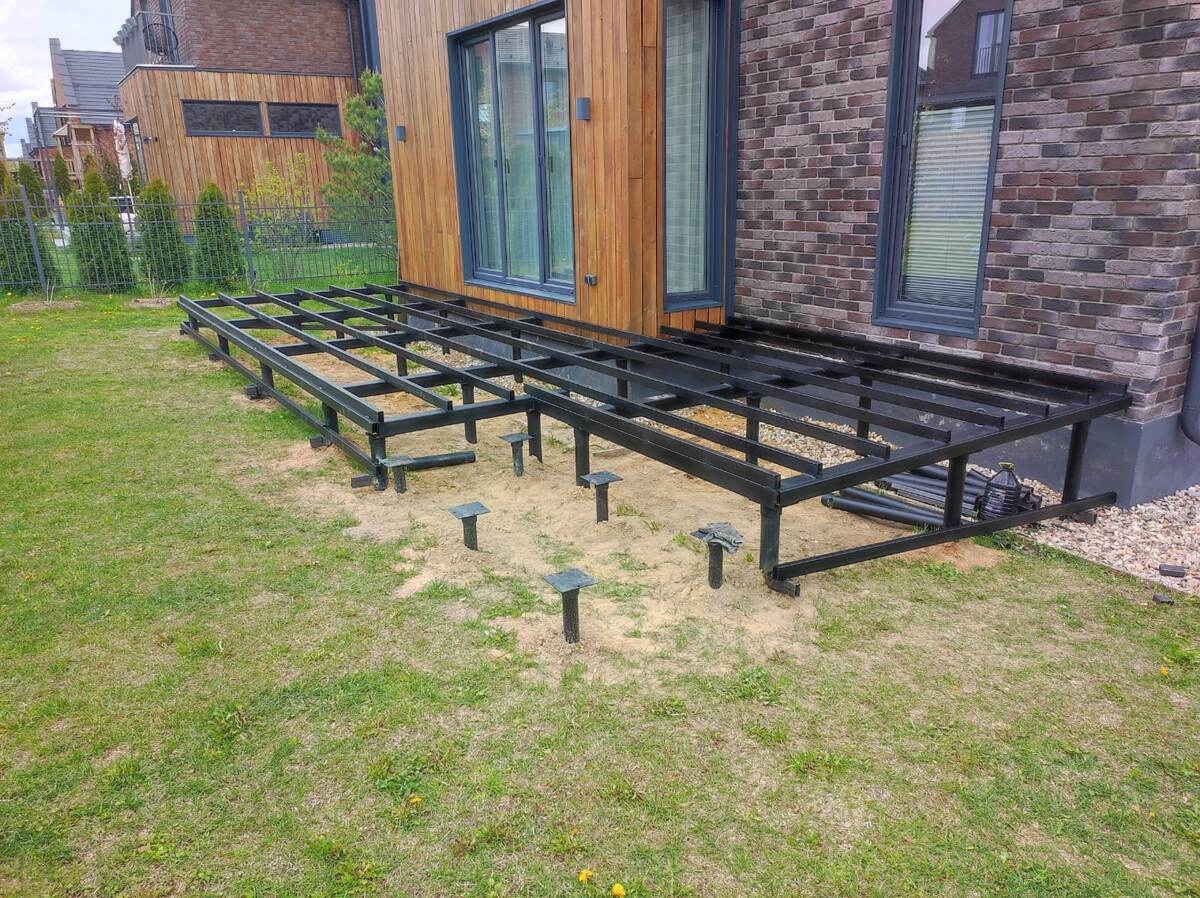 Высота террасы на сваях может быть от 10—15 см, до нескольких метров. Важно лишь учитывать, что при высоте цоколя от 50—70 см для винтовых свай требуется дополнительная боковая обвязка.