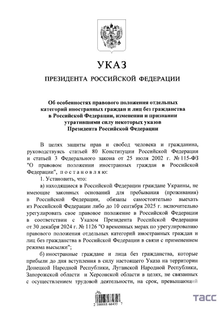 Это предписывается указом президента РФ Владимира Путина Граждане Украины, находящиеся в России без законных оснований, должны до 10 сентября узаконить свое пребывание или же покинуть страну. Это предписывается указом президента РФ Владимира Путина, документ опубликован на официальном портале правовой информации. "Находящиеся в Российской Федерации граждане Украины, не имеющие законных оснований для пребывания (проживания) в Российской Федерации, обязаны самостоятельно выехать из Российской Федерации либо до 10 сентября 2025 года включительно урегулировать свое правовое положение в Российской Федерации", — говорится в указе.