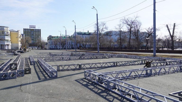 На площади в центре Оренбурга монтируют трибуны к празднованию Дня Победы