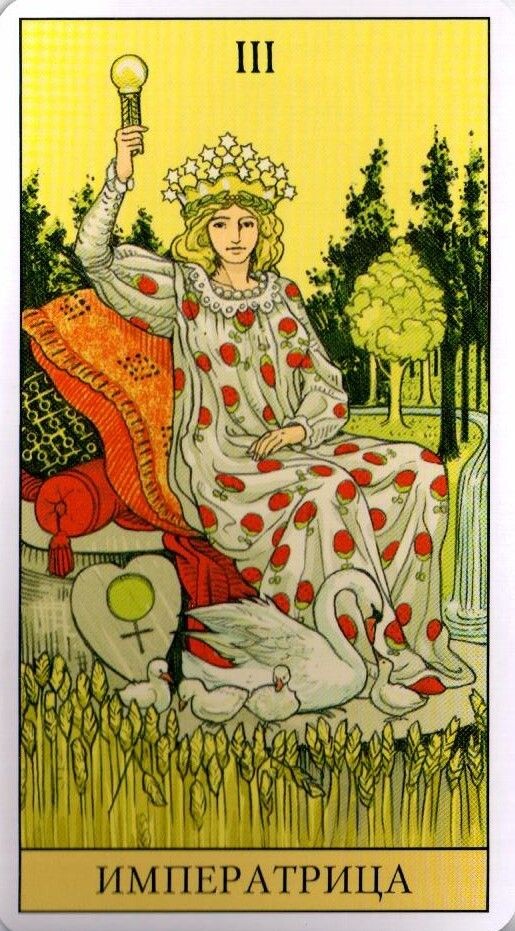 Аркан «Императрица» — третий старший аркан в колоде Таро, который олицетворяет женскую силу, материнство, плодородие и изобилие. Этот аркан часто ассоциируется с природой, красотой и гармонией, а его символика глубоко укоренилась в архетипах, связанных с женственностью и созиданием. На картах Таро «Императрица» обычно изображена женщина, окруженная природой. Она может сидеть на троне, украшенном символами изобилия — например, пшеницей, фруктами или цветами. Часто она носит корону из звезд или других символов, что подчеркивает её связь с высшими силами и её статусом как правительницы. Императрица также может держать в руках скипетр, что символизирует власть и контроль. В некоторых колодах её изображают с животным (например, с коровой или львом), что может указывать на её связь с природой и инстинктами. 1. Плодородие и творчество: Императрица символизирует не только физическое, но и творческое плодородие. Она вдохновляет на создание новых идей, проектов и отношений. Этот аркан часто ука