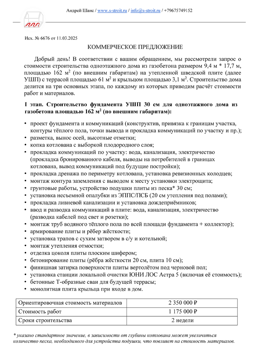 Актуальный пример КП на строительство одноэтажного дома из газобетона на фундаменте УШП площадью 162 м2. Потенциальный заказчик обратился к нам с проектом Микея-5 Front (авторы проекта – компания Оптимум Хаус). Сделали предварительный расчёт стоимости строительства и вот, что получилось: - нулевой цикл с фундаментом УШП ~ 3.5 млн ₽;