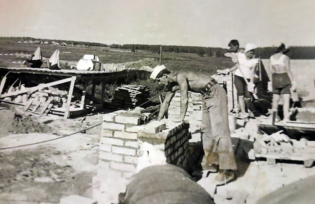 На стройке все уже было налажено, первые ряды кирпичей положены ( сначала клали стены в два кирпича ) и меня поставили подсобницей к Вите и Витюше! Эти два мальчика из Лобни, были явно знакомы с физическим трудом, а Витя, умел обращаться с уровнями , отвесами и т д и его сделали бригадиром и работал он каменщиком — в свободное от руководства время. Таким образом, мне достались сразу, полтора каменщика, а лопату — я видела только в кино..... Сначала, было ОЧЕНЬ тяжело! В мои обязанности входило обеспечить их кирпичами, раствором, расшивать швы, что бы раствор не торчал и не было дырок (была специальная железяка, но пальцем в рукавице — оказалось удобней) и самое главное - надо было размешивать бадью с раствором.... Раствор, и так спресовывался в самосвале, его перегружали в бадьи, и пока бадья была свежей — это было еще ничего! Но, если бадья постояла — размешать её , было безумно тяжело.... Как то однажды, я взвыла, чего капризничаешь, спросил Витя — но пошел помогать . Попробовал и тех пор , залежавшуюся бадью, мешал только он !