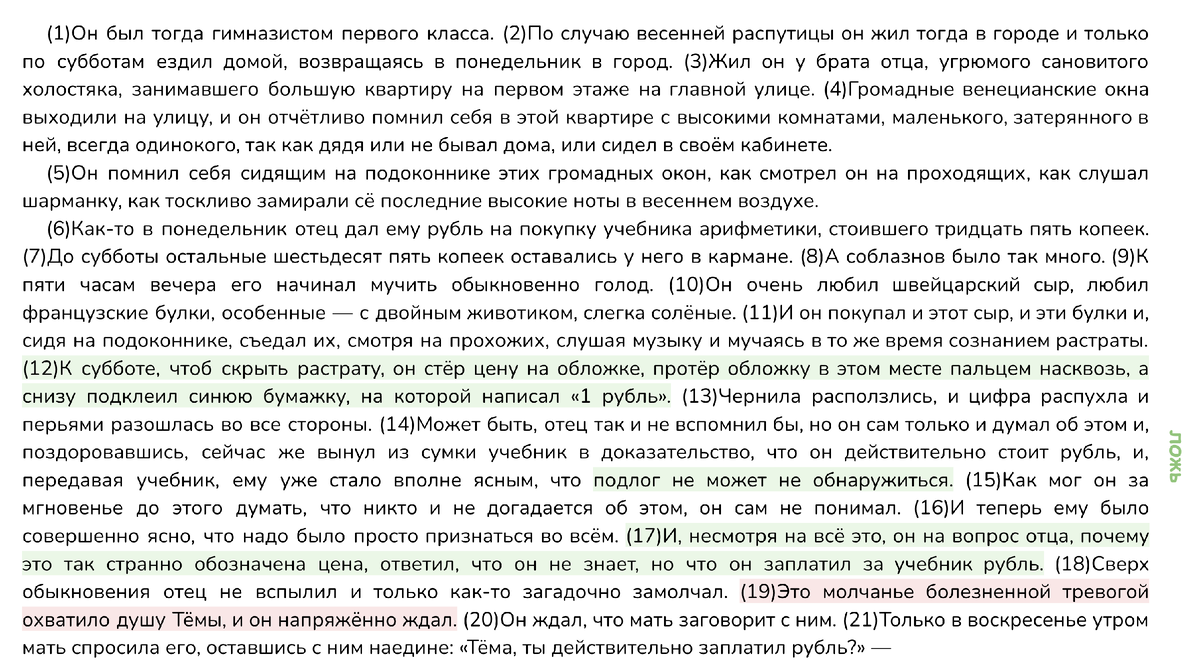 Сочинение по тексту варианта 959 ЕГКР 18.03.25 «Он был тогда гимназистом первого класса. По случаю весенней распутицы он жил тогда в городе...» Проанализируем прочитанное. Из возможных связей между примерами могу выделить две — дополнение и причинно-следственную связь. Остановлюсь на последней, чтобы наконец-то отойти от дополнения. Но если выбрать его, можно написать о том, что ложь не только мучила самого Тёму, но и разрушила его отношения с родителями. К чему приводит неспособность человека признать свою вину? По мнению Н.Г. Гарина-Михайловского, сокрытие допущенных ошибок приводит к душевным терзаниям и к разрушению доверительных отношений между людьми. Чтобы доказать свою мысль, автор рассказывает о мальчике, который втайне от родителей потратил деньги, оставшиеся после покупки учебника. Тема не смог найти в себе силы, чтобы признать свою вину, поэтому он соврал отцу и матери. Становится ясно, что гимназист боялся признаться в собственной неправоте и желал скрыть проступок. Однак