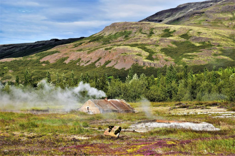 Земля в долине гейзеров курится дымками, в воздухе витает легкий аромат тухлых яиц. Романтика! Над одним из таких дымящихся участков какие-то шутники водрузили маленькую крышу с трубой. Как будто бы домик, а из трубы идет дым. Рядом парящая лужица, на камне написано, что это Маленький Гейзер. Значит, и Большой, то есть Великий, где-то здесь. Он давно пребывает в сонной фазе, и его извержение мы точно не увидим. Зато по соседству – настоящий трудяга Строккюр. На всех исландских фотографиях и магнитиках изображен именно он, а не его великий сосед. Каждые пять или десять минут Строккюр извергает в воздух кипящую струю высотой до сорока метров, только успевай ловить в кадр. Строккюр – четвертый по величине гейзер в мире. Пе