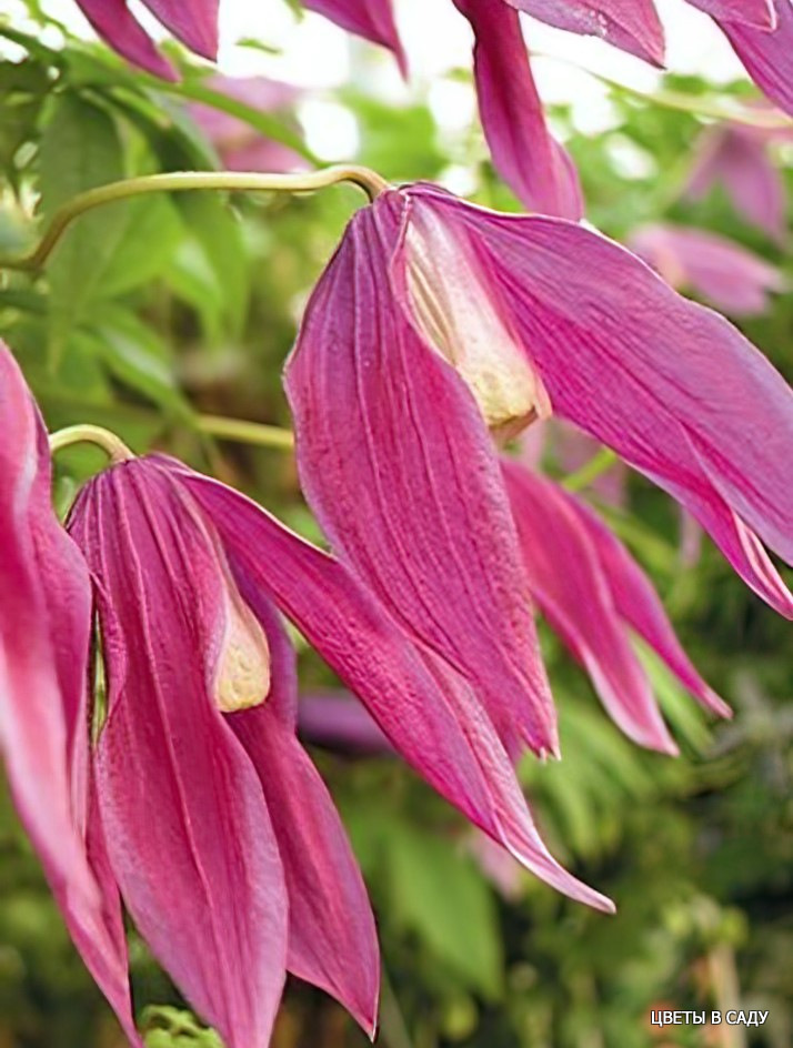 Сорт с интригующими полумахровыми, слегка повисающими розовыми колокольчатыми цветками диаметром 7 см. Цветки состоят из четырёх внешних тёмно-розовых лепестков и желтовато-светло-розовых внутренних стаминодий. За опоры цепляется листовыми черешками. С июня до осени декоративен причудливыми пушистыми плодами. Весьма морозостоек и неприхотлив. Переносит полутень. Особенно пригоден для выращивания у ограждений, камней, старых пней, лиственных или хвойных кустарников. Может использоваться как почвопокровное растение.