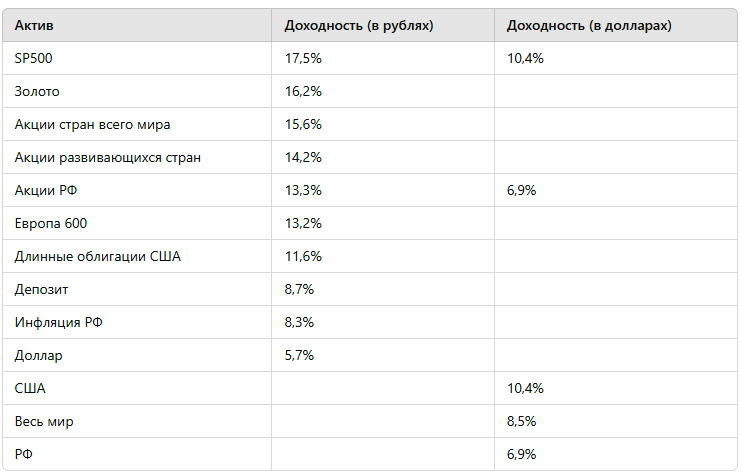 Недавно я много думал о своих активах, сравнивал их доходность, строил огромные таблицы, наслаждался диверсификацией, но так и не увидел особой пользы от нее. Хоть прошлые доходы и не гарантируют аналогичных в будущем, но если нужно оценить какую-то сложную величину, то подход с использованием «средней доходности» по данным, собранным за длительный период, мне кажется наиболее разумным. Так, например, за последние 20 лет доходность активов (с учетом дивов) распределилась следующим образом: Можно по-разному считать доходности по различным классам активов, брать разные периоды, разные точки входа, разные методы покупки (сразу на все, частями, или как-то еще) и получать в итоге разные данные, так например с 1995 по 2019 год индекс РТС опережал SP500 (12,5% против 7,8%). С 1998 года стоимость недвижимости в России выросла на 6% в рублях, но в долларах — на ноль. Если долго пытать данные они признаются в чем угодно, но на мой взгляд итог будет всегда примерно один - на горизонте 10–15 лет и