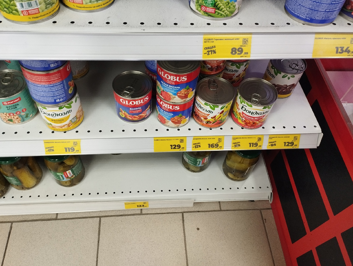 С тех пор, как я стала жить в одном городе со своей бабушкой, у меня пропала необходимость смотреть в сторону консервации, но по привычке иногда все равно останавливаюсь около этих стеллажей. Много скидок было на фасоль: у "Бондюэль" есть белая фасоль в томатном соусе за 119 рублей и без соуса за такую же цену, а есть красная в соусе чили за 169; у "Globus" в этот раз цена не ниже, консервы стоят 129 рублей (и в таком случае я бы отдала предпочтение первому производителю).
