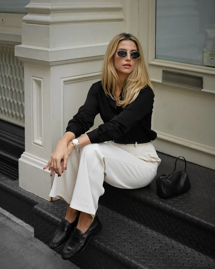 Черно-белые аутфиты смотрятся роскошно благодаря чистоте цветов. Но у этого есть и минусы — нужно выбирать максимально качественные вещи с хорошим пошивом. Иначе есть риск торчащих ниток, затяжек и просветов в самых любопытным местах.