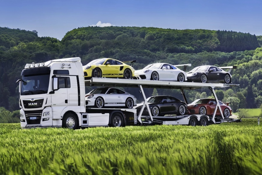 Интересный лот выставили на продажу: тягач с полуприцепом-автовозом, заполненным суперкарами Porsche.