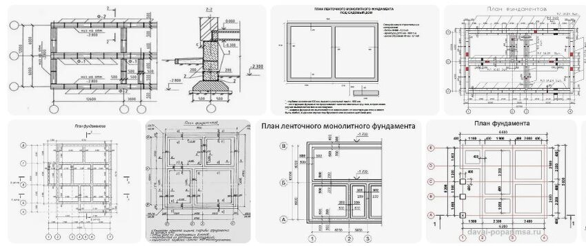 Как правильно сделать план ленточного фундамента? Я же правильно понимаю, что нужно делать чертеж сечения фундамента и чертеж расположения блоков?? Нужно сначала иметь проект дома, чтобы знать, где будет какая стена, чтобы под нее фундамент заливать? С чего вообще нужно начинать заливку фундамента? Вопросов много, это наша первая стройка. На какой глубине должен залегать фундамент? План ленточного фундамента делать обязательно. Там указывается глубина залегания фундамента, ширина, которая рассчитывается с учетом веса здания и коэффициента сопротивления почвы, сама схема фундамента, т. е. где и какие стенки-перегородки будут. Лучше все расчеты доверить специалистам. Хотя можно на каком-нибудь строительном сайте найти специальный онлайн калькулятор, который все просчитает.