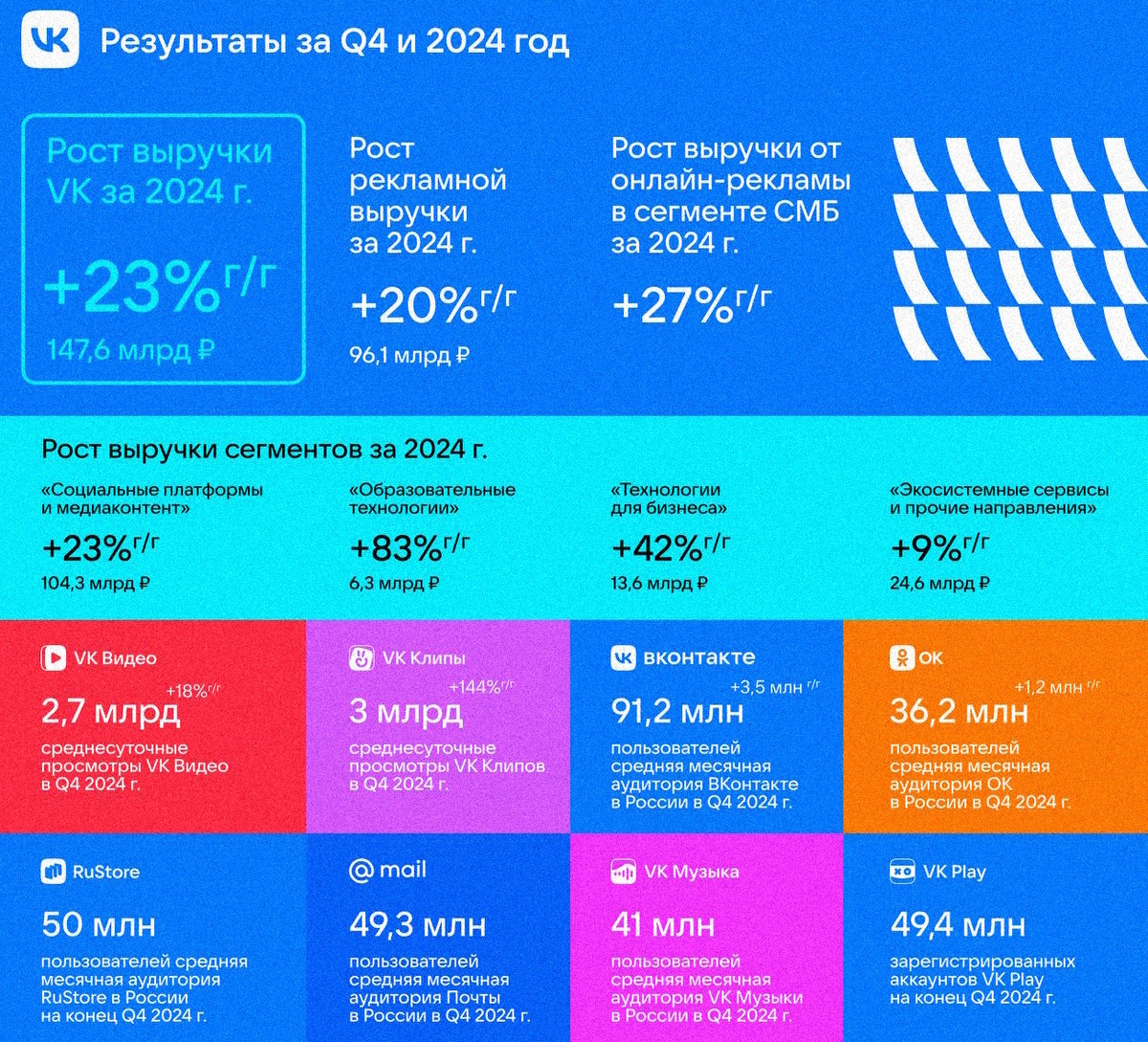 VK сообщила о доходах за 2024 год, составивших 147,6 миллиардов рублей. По данным компании, выручка увеличилась на 23% по сравнению с предыдущим годом. Основной источник доходов — онлайн-реклама, выручка от которой выросла на 20% и достигла 96,1 миллиарда рублей. VK Tech показала рост на 42%, достигнув выручки в 13,6 миллиарда рублей. Образовательные сервисы для детей увеличили свои доходы на 83%, составив 6,3 миллиарда рублей. Пользователи провели в VK на 30% больше времени, чем годом ранее, в среднем тратя 4,4 миллиарда минут в день на все сервисы платформы. Время просмотров в VK Видео увеличилось в 4,5 раза по сравнению с концом 2023 года. Впервые за три года VK представила прогноз, согласно которому скорректированный показатель EBITDA по итогам 2025 года превысит 10 миллиардов рублей. Компания также рассматривает возможность дополнительной эмиссии акций на сумму 115 миллиардов рублей, что, по мнению аналитиков, положительно скажется на рентабельности.