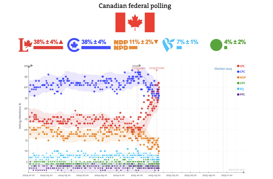 С момента отставки премьер-министра Джастина Трюдо в начале марта рейтинг правящей Либеральной партии Канады вырос почти на 18 п.п., в то время как поддержка главной оппозиционной Консервативной партии продолжила стремительно сокращаться. Рейтинги обеих партий находятся на уровне 38%. Баланс сил изменился благодаря смене руководства в Либеральной партии. Новый премьер-министр Марк Карни не связан с непопулярным правительством Трюдо и обещает решить созданные им проблемы. Карни активно перенимает наиболее популярные тезисы предвыборной программы оппозиции, которые в основном касаются жесткой риторики в отношении США и Дональда Трампа. Если такая тенденция продолжится, то консерваторы могут объединиться с другими оппозиционными партиями для попытки вынесения правительству Карни вотума недоверия. Так они смогут увеличить количество собственных мест в парламенте нового созыва и ослабить набирающих популярность либералов. Официально парламентские выборы в стране должны пройти 20 октября.