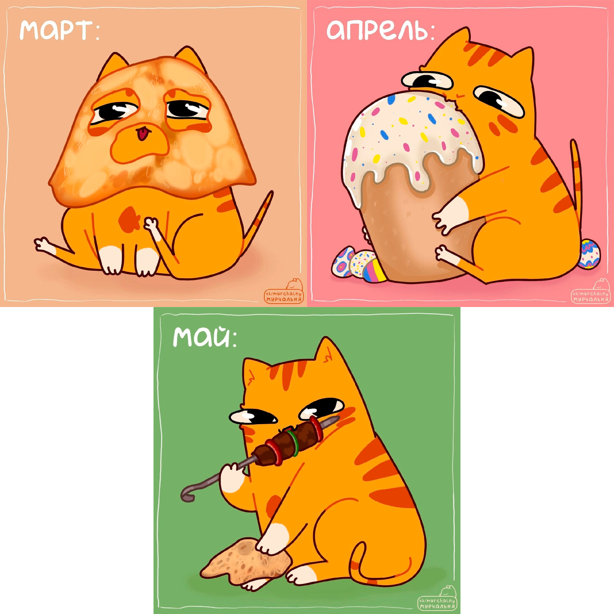 Давненько не было тематических праздничных подборок, но раз уж не календаре нынче начало мая - самое время для комиксов на тему майских праздников. Ну а что многие люди делают во время длинных весенних выходных? Конечно же, едут на шашлыки! И сегодняшний материал как раз посвящен этой теме - я нашел для вас несколько забавных комиксов про весну, природу, и жарку шашлыков. Надеюсь, что вам понравится! В рамках проекта под названием МУРЧАЛЬНЯ выходят забавные комиксы с участием нескольких непоседливых котов. В одной из таких зарисовок была затронута тема праздничной еды, которую принято есть в разные месяцы весны. Получилось ярко и наглядно. Еще один комикс про котов, весенние месяцы и шашлыки нарисовала художница под псевдонимом ro_aiva - в своем комиксе она решила сравнить, как пушистый питомец может измениться с марта по май. У московского художника под псевдонимом Martadello есть целый набор авторских персонажей и рубрик. К примеру, некоторые сюжеты в комиксах этого автора происходят