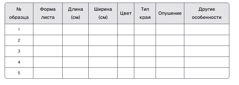 Записывайте результаты описания в таблицу (см. пример ниже). - Анализ результатов:Сравните описания всех экземпляров и выявите общие признаки, характерные для данного вида.