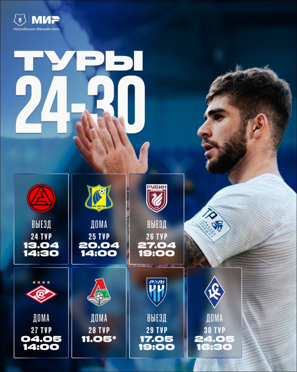 Воронежский «Факел» узнал календарь оставшихся игр в МИР РПЛ нынешнего сезона. В пресс-службе чемпионата опубликовали расписание матчей на апрель-май. Речь идёт о встречах, запланированных с 24-го по 30-й тур. Расписание для «огнеопасных» выглядит следующим образом: 24 тур – Акрон-Факел (13 апреля); 25 тур – Факел-Ростов (20 апреля); 26 тур – Рубин-Факел (27 апреля); 27 тур – Факел-Спартак (4 мая); 28 тур – Факел-Локомотив (11 мая*); 29 тур – ПариНН-Факел (17 мая); 30 тур – Факел-Крылья Советов (24 мая). Из-за празднования 9 мая 80-летия Победы точный график 28-го тура, запланированного на праздничную неделю, находится в дополнительной проработке с федеральными органами исполнительной власти. После согласования расписание этого тура сообщат позже. В данный момент «Факел» занимает 15-е место, имея 14 очков. «Огнеопасные» находятся в зоне прямого вылета в ФНЛ за девять оставшихся матчей. Впереди игра с лидером сезона – «Краснодаром». Дмитрий Амелин