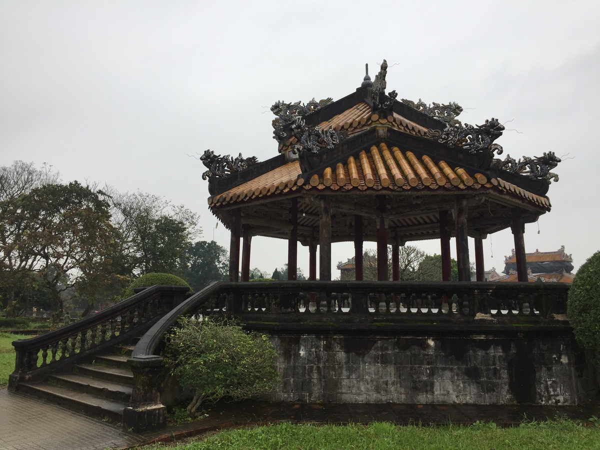 Из трёх посещенных более всего впечатлила и понравилась гробница Кхай Минн – компактное изящное трехтеррасное сооружение. Строилась гробница в течение одиннадцати лет как из современных на тот момент зарубежных материалов, таких как сталь и железо, так и традиционной вьетнамской терракоты. Архитектурно же мавзолей совмещает в себе элементы классических средневековых замков. Яркая сочная зелень гармонично контрастирует с преобладающим серым цветом построек, множества скульптур вооруженных воинов и высоких обелисков – символов власти и могущества императорской династии.
