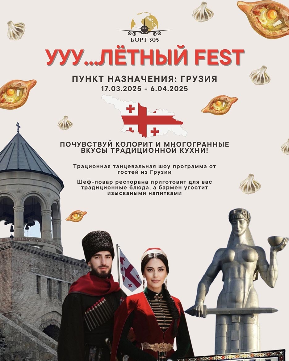 Ууу…лётный fest на БОРТу 305 продолжается и следующая остановка ресторана — Грузия! С 17.03.2025 по 6.04.2025 включительно. Погрузитесь в колоритную культуру и почувствуйте яркие и многогранные вкусы Грузии. По субботам для всех гостей ресторана танцы от национального ансамбля, которые зажгут сердца гостей и перенесут в атмосферу праздника. Яркая Грузия ждет вас на БОРТу 305.