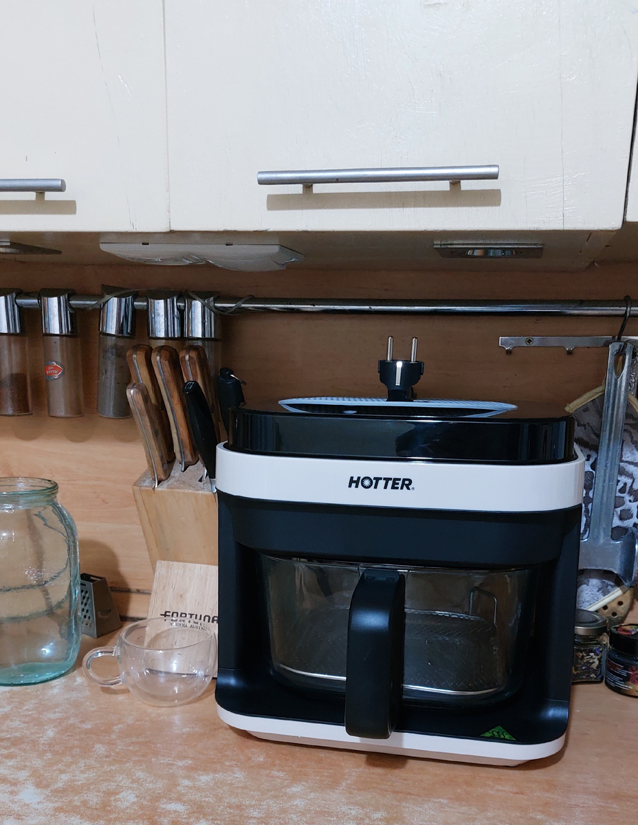 Говорят, первая волна на эту кухонную технику случилась больше 10 лет назад. Я тогда активно дружила с мультиваркой и про такую машинку даже и не слышала. А тут...я даже сама не понимаю сейчас откуда и почему во мне проснулся интерес к аэрогрилю. Может, у кого-то из блогеров присмотрела, может на маркетплейсе промелькнуло, или реклама какая в соцсетях. Выбирала - изучала 2 недели, не спала три ночи, выносила мозг на обсуждение всей семьи. И вот, случилось! Выбрала со стеклянной чашей, потому как на опыте с мультей знаю, что антипригарное покрытие очень быстро куда-то испаряется. Да, чаша тяжеловата - 2,4 кг, но не критично. Моется легко. Объем 5,5 литров, я решила, что на семью из 4х человек мясо-курицу запечь будет достаточно. Что еще сказать- на кухню вписалась чудесно, места занимает немного, выглядит симпатично в целом. Конечно же, первое что приготовили - картошку, которая фри. Автоматическая программа на гриле сработала идеально: три крупные картошки, соль и столовая ложка