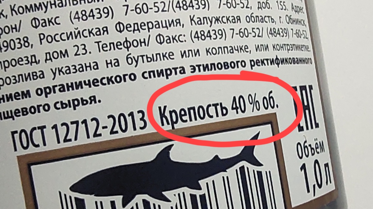 Надпись «водка 40 об.» означает, что 40% объёма напитка составляет спирт, а остальное — вода и добавки. В народе же говорят, что в водке 40 градусов.