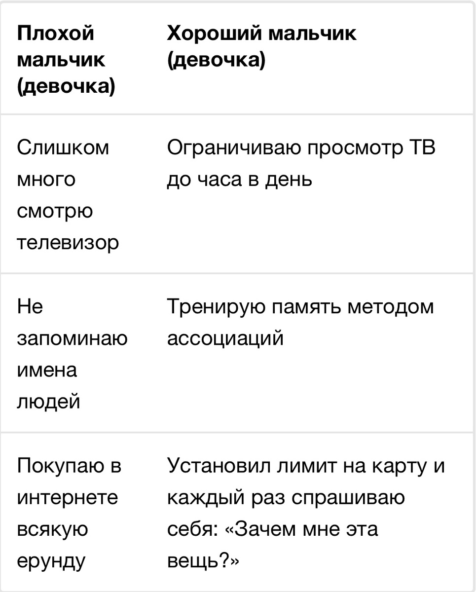 В своей книге Том Корли предлагает взять лист бумаги и разделить его на две части. В левом столбце перечислите свои негативные привычки, а в правом — то, как их можно изменить. Например, так: