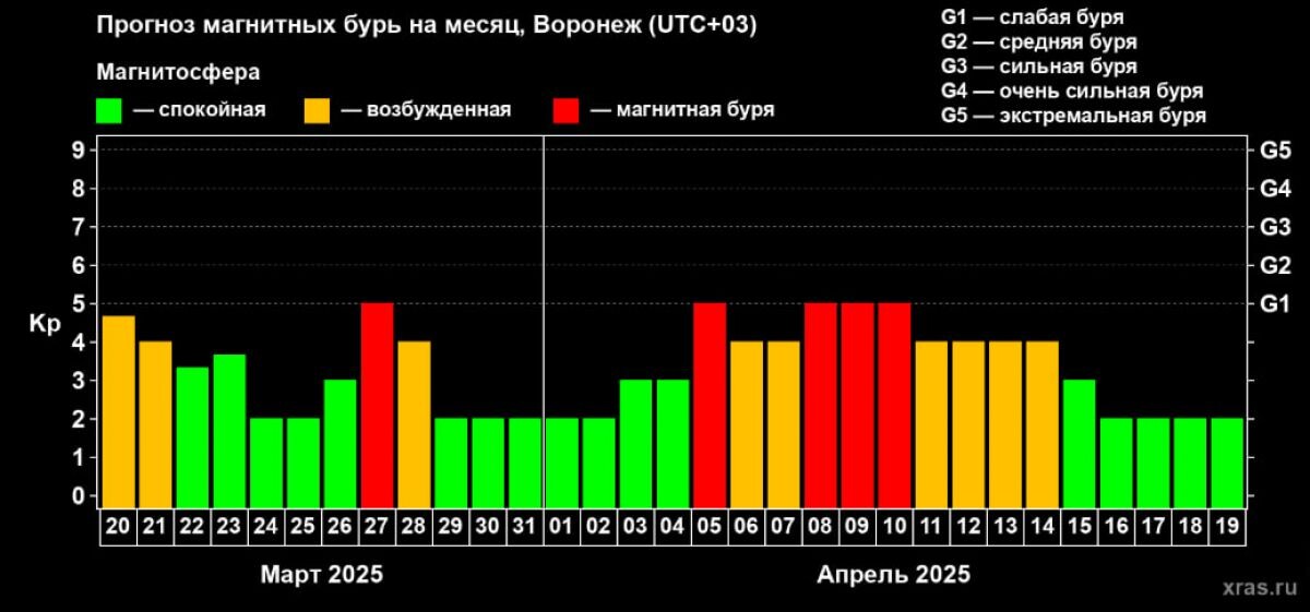 Середину новой рабочей недели метеозависимые могут провести с головной болью, ведь магнитосфера начнет "шалить". Об этом стало известно из прогнозов от лаборатории солнечной астрономии ИКИ РАН и ИСЗФ. Слабая магнитная буря придет к воронежцам уже 27 марта, и продержится, возможно, сутки. Затем магнитосфера спадет до возбужденной 28 марта, и постепенно все придет в норму. Но не надолго... Судя по прогнозам, апрель не пощадит никого: слабая магнитная буря начнется 5 апреля и будет колебаться от возбужденной до слабой бури вплоть до 14 марта. Напомним, ранее метеозависимых воронежцев предупреждали о магнитных бурях в марте. Согласно данным ученых, рост солнечной активности начался 13 марта около 00:00 часов. Прогнозировалась небольшая буря класса G1. Вероятность явления составляла 51%.